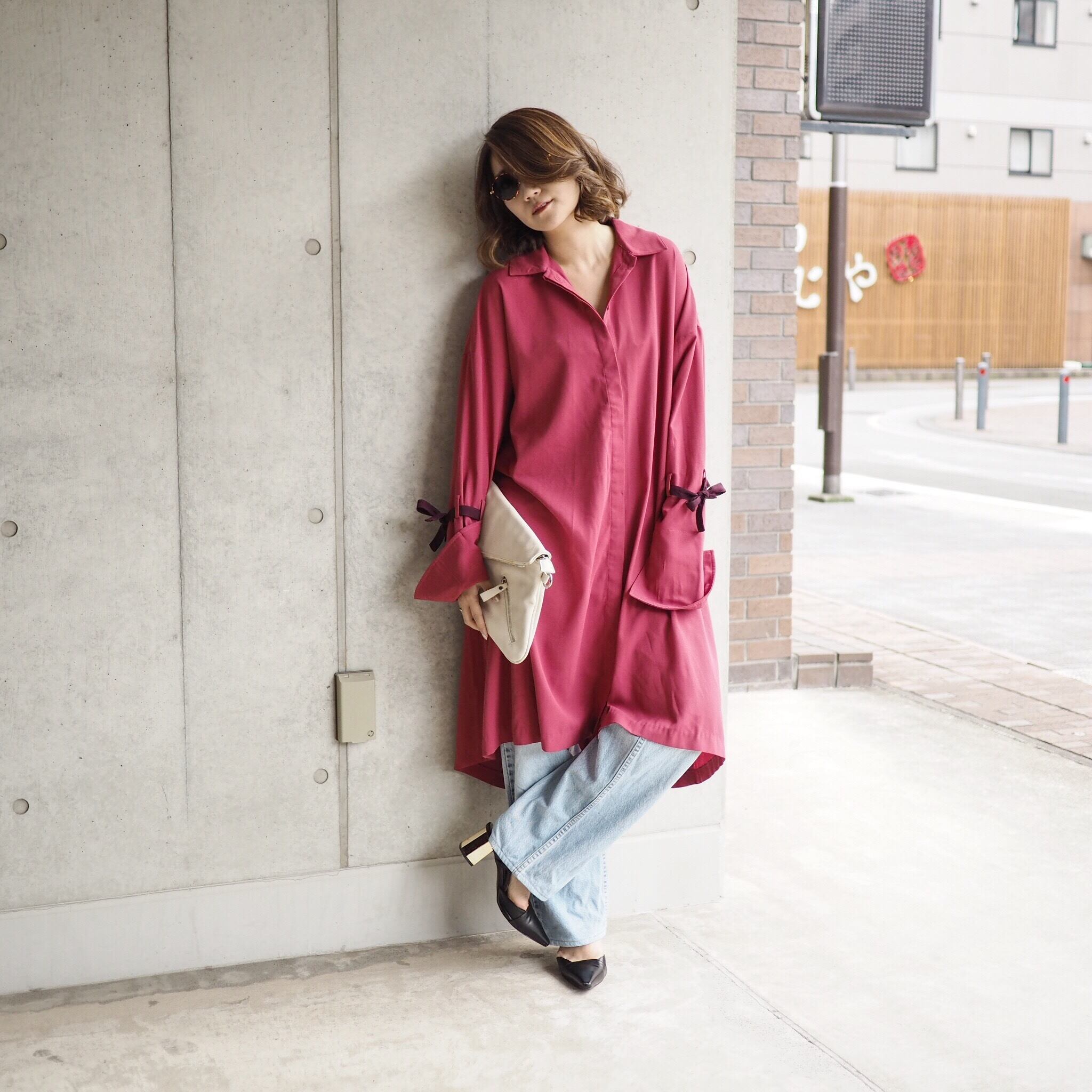 共地のサッシュリボン付で、ウエストマークしてもロングシャツとしても、自在に着こなせます。