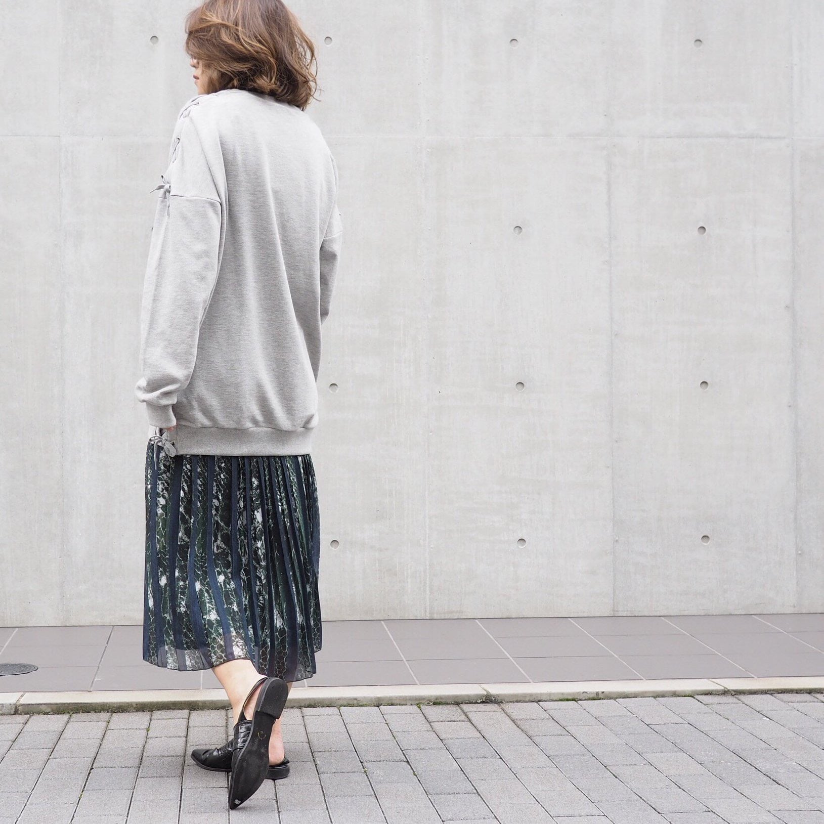 肩と裾にレースアップデザインが施されたデイリーユースにぴったりなスウェットトップス。 少し長めの着丈で、ゆったりとリラックス感のある着心地です。 レースアップ部分は、ハトメのアクセントが効いたディティール。 100% cotton
